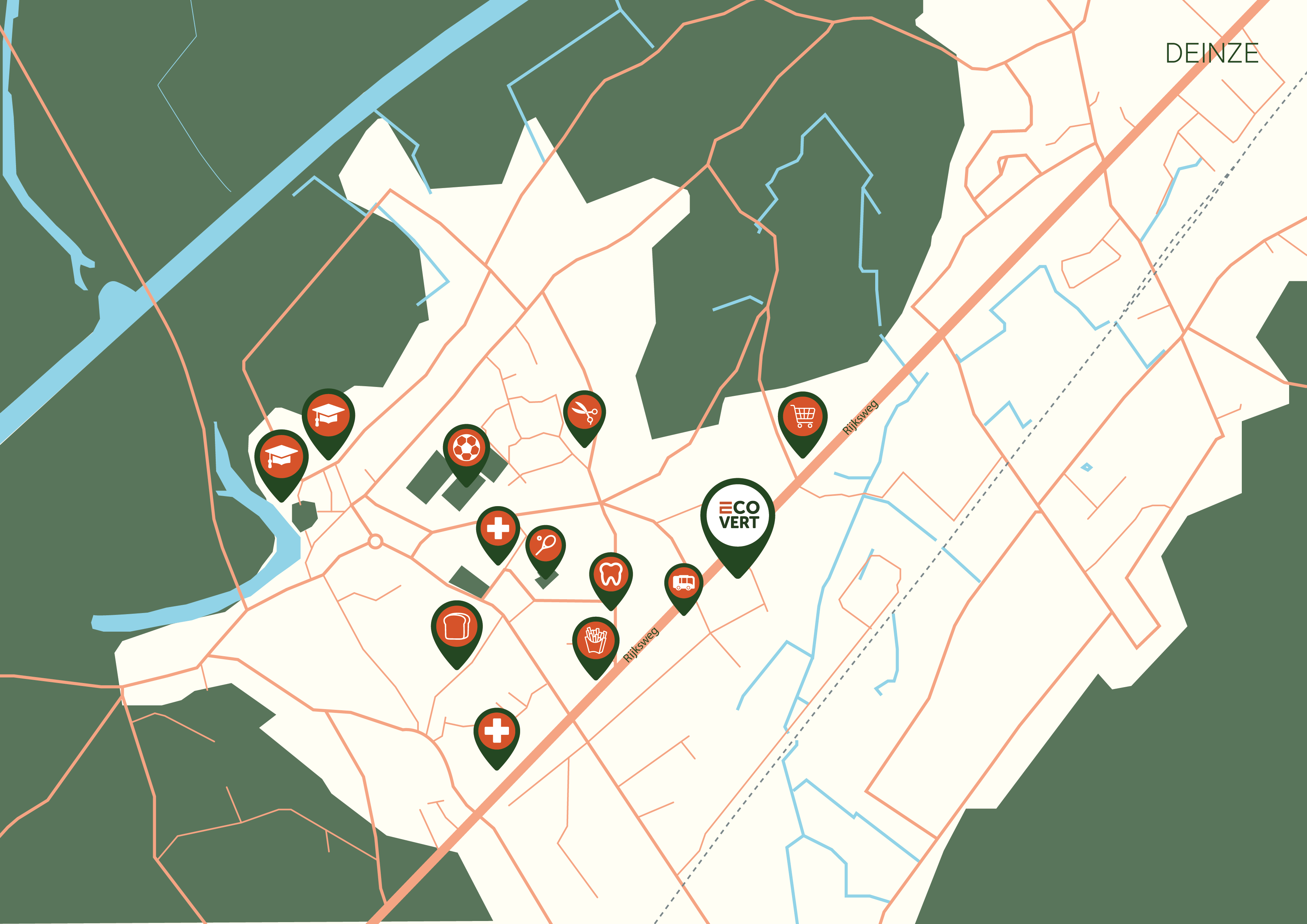 Op 10 minuten fietsen van Deinze, omringd door het rustige dorpsleven, komt met Eco-Vert een levendige community tot leven. Laat je kinderen spelen in de zonnige tuin, terwijl jij contacten legt met de buren. Of geniet van een heerlijk gerechtje op je terras, waarvan je de verse ingrediënten net te voet bent gaan halen. Eco-Vert is een hechte buurt, met zowat alles binnen handbereik. In de week ga je met de fiets naar het werk. In het weekend geniet je van fietstochtjes langs